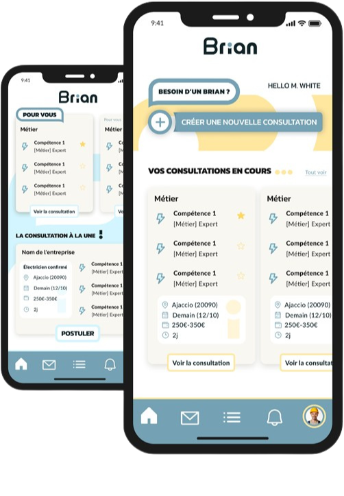 Brian est une solution 100 % BTB qui simplifie la collaboration entre entreprises et artisans indépendants. Grâce à une application mobile intuitive, tout se fait en quelques clics : recherche, contrat, paiement et évaluation.